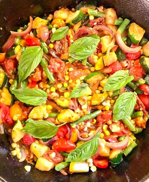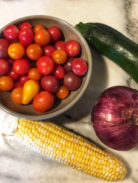 Summer is the season of tomatoes, zucchini, corn and green beans, so why not add them all together and make a delicious and simple summer succotash? I created this last summer when I had an abundance of tomatoes and zucchini in my farm box, along with green beans and basil in my garden. It's the perfect companion for grilled salmon or chicken or whatever you fancy. I started making it again a few weeks ago and it's too good not to share!